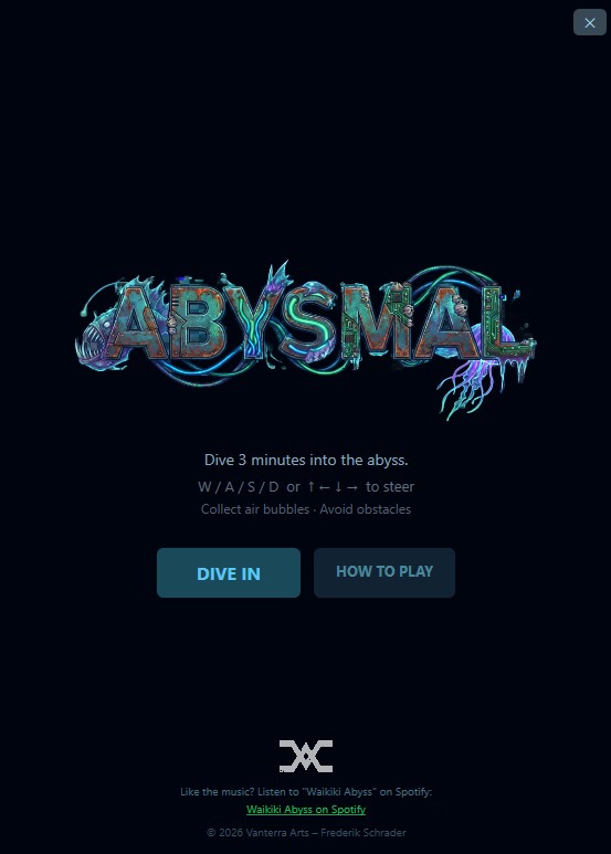 ABYSMAL was built around a song, Waikiki Abyss by Fred Vanterra, and runs for exactly the length of one dive — three minutes of cinematic atmosphere that pulls you deeper with every beat. The game and the track were designed together, and it shows.